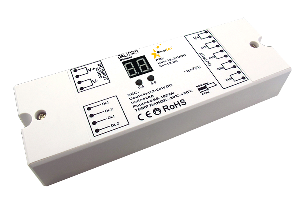 The PowerLED range of DALI Dimmers includes units that offer 1 DALI address, 4 DALI address options as well as a unit with push dimmer functionality. The products incorporate a screen to display the Dali address, which can either be set manually or automatically when using a Dali master. The DALI controllers are compatible with DALI systems from OSRAM, TRIDONIC, HELVAR etc. Models available :DAL1DIM1 - 4-channel DALI dimmer with 1 addressDAL1DIM4 - 4-channel DALI dimmer with 4 addressesDAL1DIP1P - 4-channel push-dim DALI dimmer with 1 address