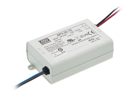 APV Series are a range of 8 ~ 35W AC/DC constant voltage LED drivers with full range 90 ~ 264VAC input and output models of 12V, 15V, 24V and 36V. Of a Class II design with 94V-0 flame retardant plastic enclosure APV Series are an ideal solution for entry level LED applications.